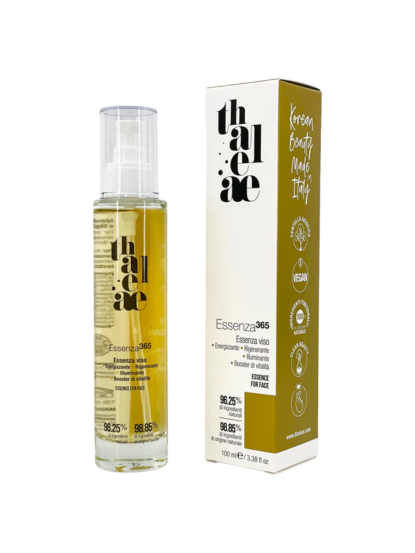 L’Essenza365 è un prodotto fondamentale nella Beauty Routine Koreana che si utilizza sempre dopo la detersione in più fasi e che è capace di potenziare la skincare routine e di rendere la pelle capace di ricevere l’efficacia dei prodotti applicati successivamente grazie alla sua azione rigenerante concentrata. Noi di Thaleæ abbiamo creato un’essenza adatta per tutti i tipi di pelle e ricchissima di attivi naturali fermentati ed enzimi. L’ingrediente chiave è la centella asiatica, arricchita di estratti purificanti e rigeneranti per un effetto leggermente esfoliante e per un’azione altamente idratante degli strati superficiali dell’epidermide di viso, collo e decolleté. L’innovazione per la cosmetica occidentale è la presenza del Kombucha, un te’ fermentato molto prezioso in oriente perché ricchissimo in probiotici, vitamine, minerali e composti biologicamente attivi, polifenoli e flavonoidi per un’azione anti-ossidante tra le più complete. Fondamentale la presenza di Acido Ialuronico derivato da fermentazione a 3 pesi molecolari: il più completo pool per donare un effetto anti-età di massima efficacia visibile. Completano gli effetti purificante, rigenerante, idratante gli estratti di ananas e papaia e enzimi esfolianti. Non contiene profumo o oli essenziali. La leggera profumazione è dovuta al Kombucha e agli ingredienti naturali fermentati.