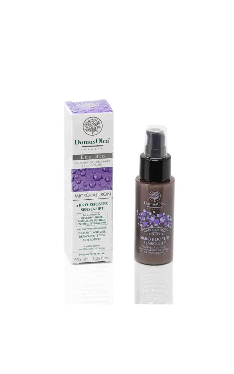 Fitocomplessi esclusivi Domus Olea Toscana di Foglie d’Olivo, Farro Monococco, Ribes Nero, Mora selvatica, Timo, Vite Verde, Elicriso + Estratti di Aloe, Equiseto, Rusco, Liquirizia, Arnica, Ippocastano, Mirtillo, Meliloto + Acido Ialuronico Micro e a basso peso molecolare + Olii di Borragine, Lino, Canapa, Jojoba, Burro di Karité + Betaina, Allantoina, Bisabololo, Betaglucano, Ceramide 3 + Sodio PCA, Glicerina vegetale, Miele + Escina, Rutina + Vit. A, C (3 forme), E (2 forme), B2/Riboflavina, B3/PP/Niacinamide, Pantenolo/B5 + Zinco, Potassio, Magnesio, Calcio + Glicina, Serina, Prolina. Funzionalità basate su tradizione erboristica o letteratura scientifica o test sugli ingredienti.