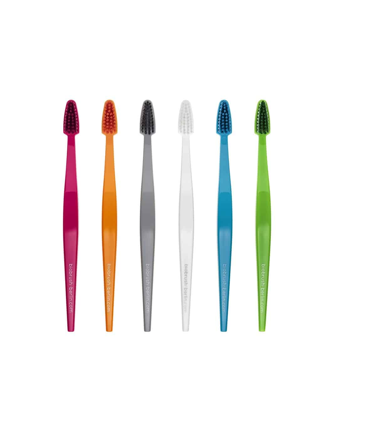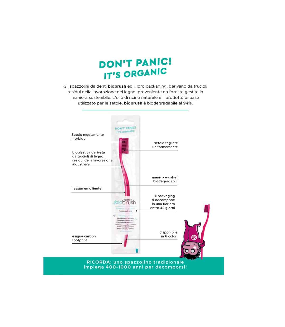 ● biodegradabile* – I colori utilizzati per gli spazzolini sono conformi alla normativa DIN EN 13432. La bioplastica è biodegradabile in conformità con la normativa DIN EN ISO 14855 mentre le confezioni sono compostabili e hanno già vinto dei premi.
